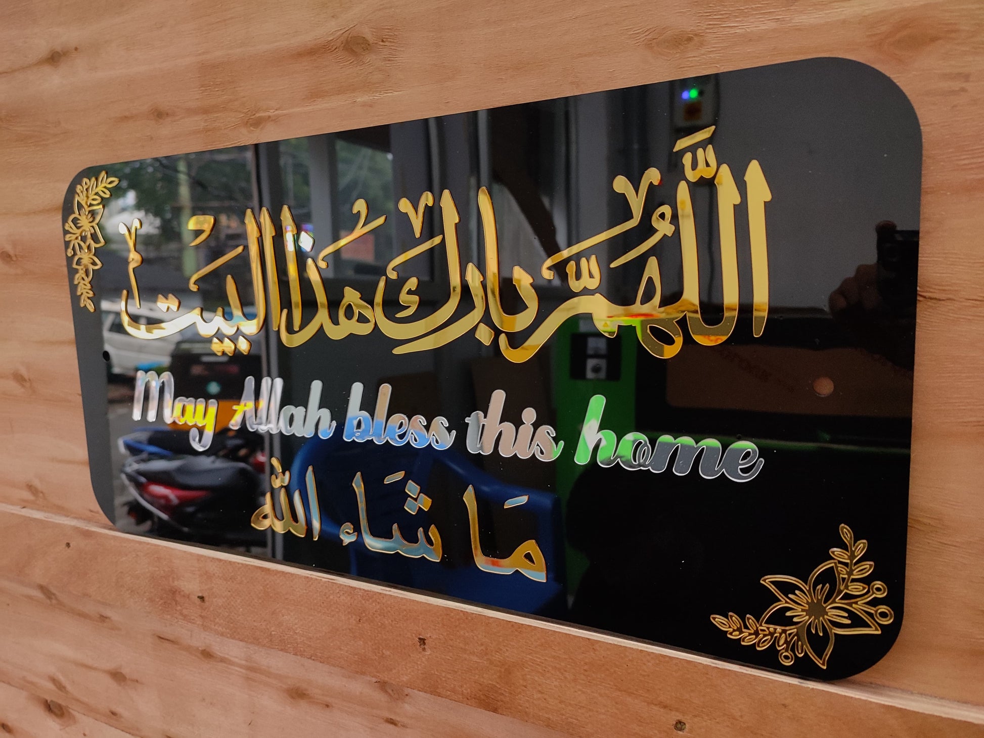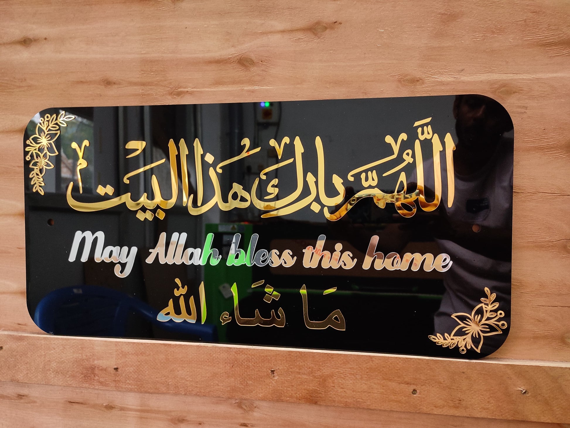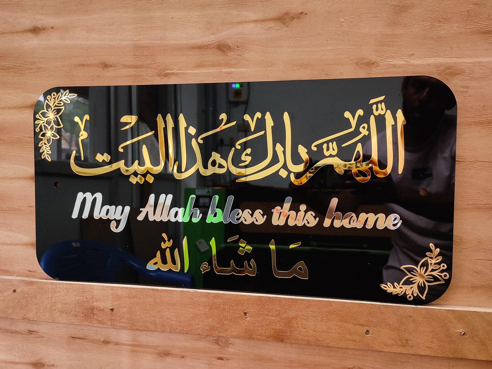 Welcome blessings and seek protection with this magnificent Home Blessing Plaque. Featuring the Dua "Allahumma Barik Hadha Al-Bait" ("May Allah bless this home") and "Masha Allah," this piece uses 3D gold mirror acrylic calligraphy on a sleek black base to create a truly luxurious and spiritually meaningful entryway sign of 2x1 feet (60x30 cm) size.
