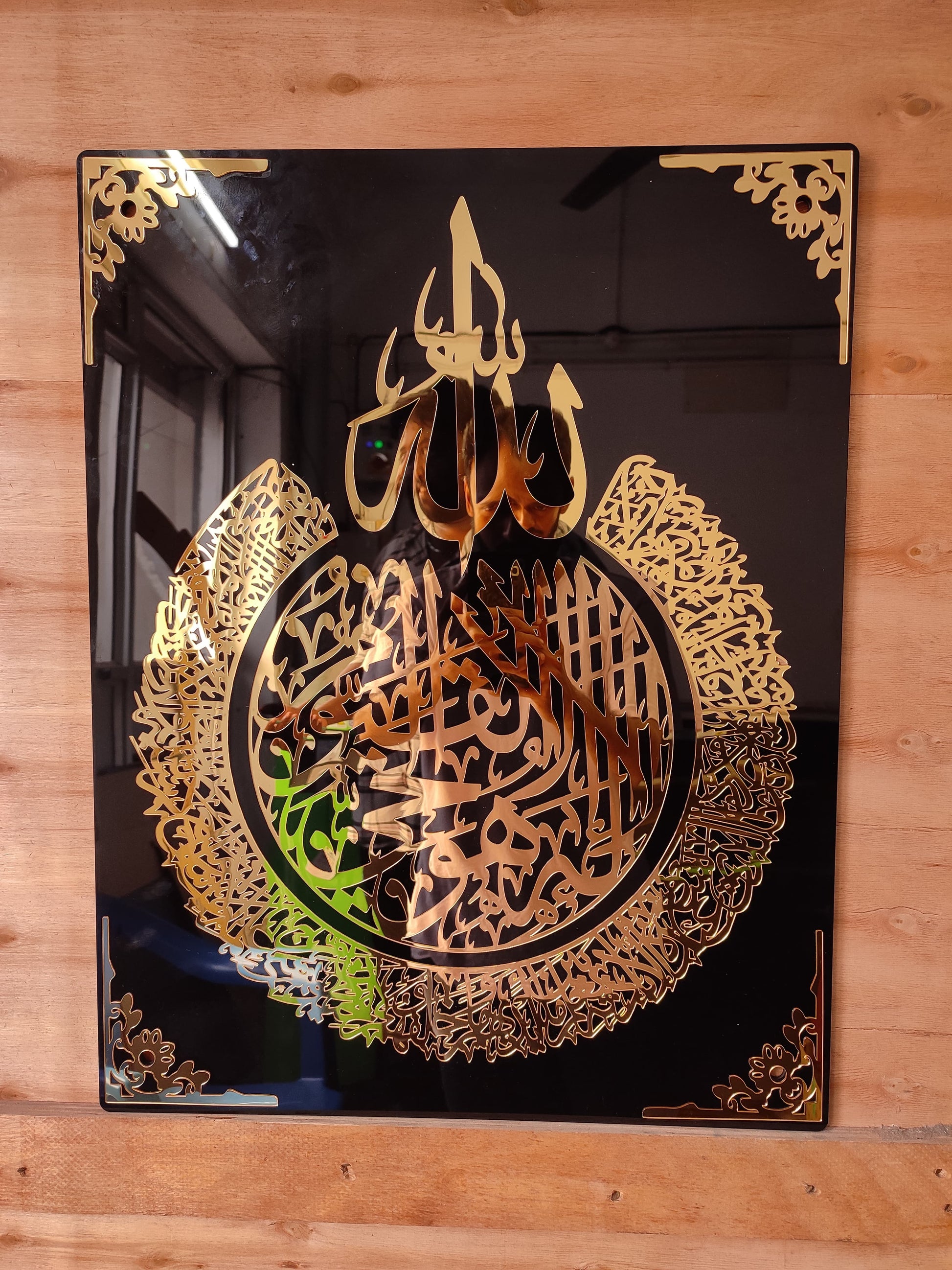 Design: Intricate 3D Gold Mirror Calligraphy layered over a high-gloss Black Acrylic base.