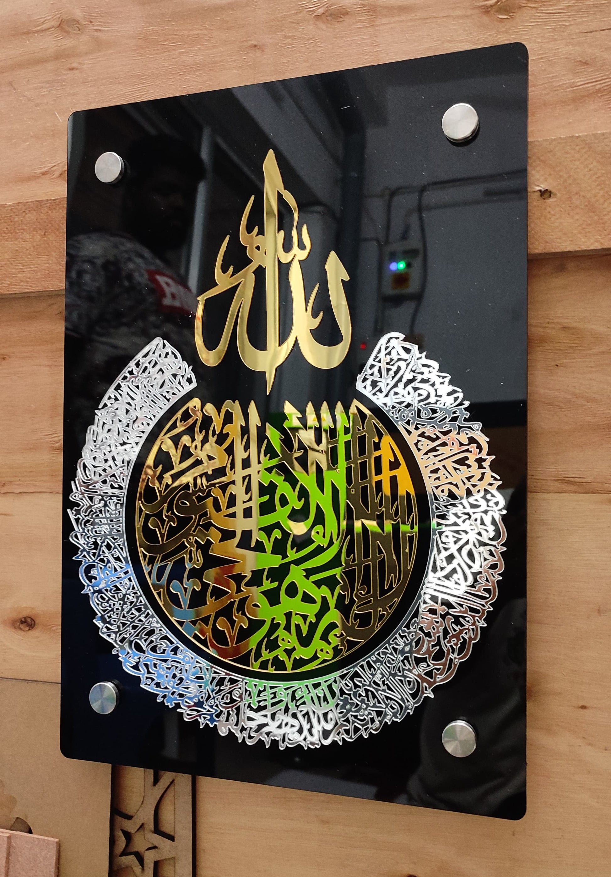 Design: Intricate 3D Gold & Silver Mirror Calligraphy layered over a high-gloss Black Acrylic base.